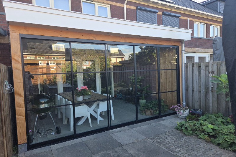 - Voor veel licht en buitenplezier de glazen schuifdeuren met zwart profiel